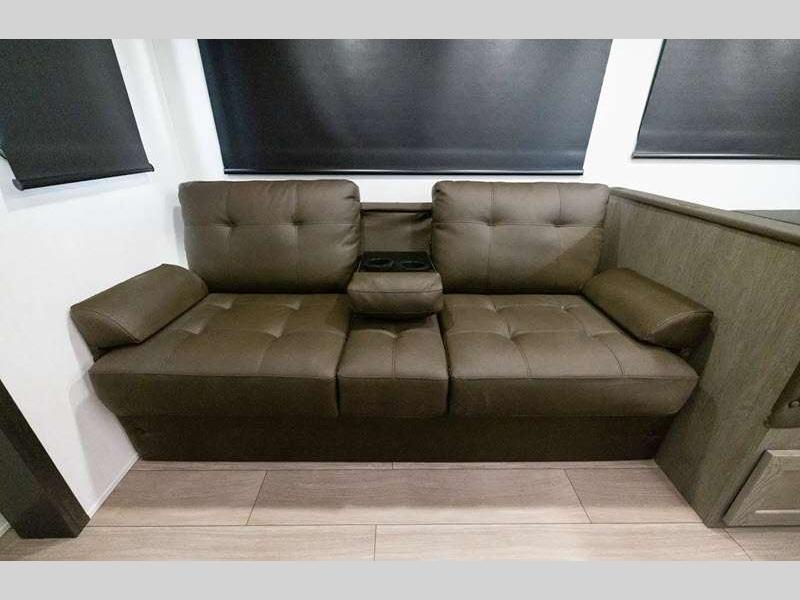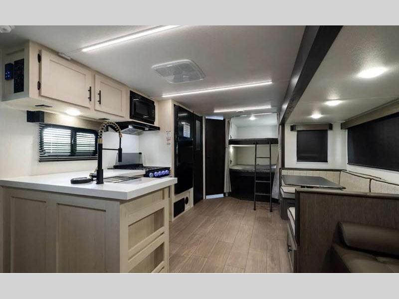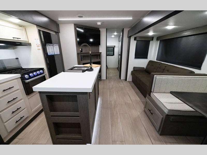 Each Alpha Wolf is constructed with a 1x engineered wood "SuperTruss" roof structure and upgraded laminated exterior walls for a tough travel trailer that will last. You will love the carpetless floor design for easy cleaning, plus there is a super-lumen lighting system with a dimmer in the living room, kitchen, and main bedroom to keep your space bright. Outside, you'll appreciate the "SuperStor" basement storage compartment, along with a power front jack with a light, an exterior shower, and 12V heat pads on all holding tanks for added protection.