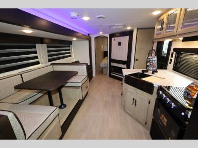If you've been searching for a travel trailer with a larger sleeping capacity to camp with friends, this is the one! There are double-size bunks in the rear corner, and the full bath with its own exterior entry door is in the other rear corner for easy nighttime use. Up front, an RV king bed in the private bedroom is sure to bring a great night's rest, and you'll find a bedside wardrobe to keep your clothes picked up off of the floor. In the morning, everyone can meet in the main living room that includes a large slide out, U-shaped dinette, sofa, and a fireplace with a hidden pantry behind it for smart storage solutions. An outside kitchen will allow you to get some fresh air as you make dinner, but there's also a full interior kitchen if the weather isn't cooperating. Additional outdoor features include a rear storage rack, an outside TV mount, and a 15' awning for some shade!