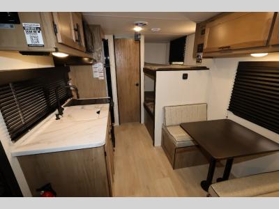 The whole family can sleep comfortably in this travel trailer! It has a set of bunk beds for the kids to sleep on, and you can sleep comfortably on the front queen bed with overhead cabinets and a shelf. There is even an exterior storage plus door that accesses the storage space under the bottom bunk. The chef will enjoy preparing their best home cooked meals either indoors with the high output cooktop or at the outside mini kitchen while staying protected by the 12' power awning!