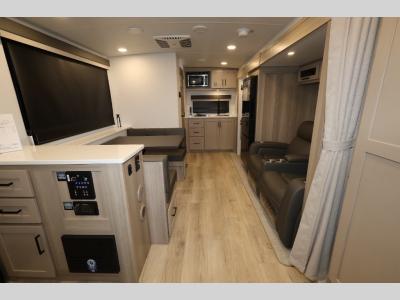 You'll be met with comfort at every turn in this spacious travel trailer. There is a large slide out which houses the theater seat, cooktop and refrigerator, plus a second slide out with a pantry/wardrobe for extra storage. You can sleep great each night on the front 60" x 74" queen bed, and there is flip-up storage underneath for extra blankets, boards games, and more. Once dinner has been made, you can dine at the booth dinette, or take your plate outdoors to relax under the 20' power awning. This unit also includes a full bath so you don't have to use the camp's facilities in the middle of the night!