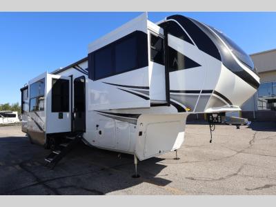 Sleeps 6 Slides 5 Length 41 ft 4 in Ext Width 8 ft 5 in Ext Height 13 ft 5 in Int Height 8 ft 1 in Exterior Color Standard Graphics or Aurora, Midnight, Pearl Full-Body Paint Options Hitch Weight 3052 lbs GVWR 19000 lbs Dry Weight 14866 lbs Fresh Water Capacity 81 gals Grey Water Capacity 106 gals Black Water Capacity 106 gals Tire Size ST215/75R 17.5 LRH Furnace BTU 35000 btu Available Beds Queen Refrigerator Type 12V Refrigerator Size 20 cu ft Cooktop Burners 4 Shower Size 48" x 30" Number of Awnings 2 Axle Weight 8000 lbs LP Tank Capacity 30 lbs. Water Heater Type Tankless On Demand AC BTU 30000 btu TV Info LR LED Smart TV Awning Info 14' 5" and 15' 5" Power w/Integrated LED Lighting Axle Count 2 Washer/Dryer Available Yes Number of LP Tanks 2 Shower Type Shower w/Seat Electrical Service 50 amp Similar Fifth Wheel Floorplans