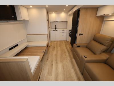 Have everything you need in a compact and well-equipped travel trailer. In the main area there is a large 42" x 82" U-shaped dinette with plenty of room to enjoy a meal, games or sharing stories. Across there is theater seating located in the slide-out that adds extra comfort and seating space. You can enjoy cooking every day from a quick pancake to your favorite casserole in the cooktop with oven and store leftovers in the 10.6 cu. ft. refrigerator. Moving forward you'll find convenient storage options such as the pantry with removable shelves. In the front you'll find a spacious 66" x 80" Olympic queen bed, on each side wardrobes for more storage.
