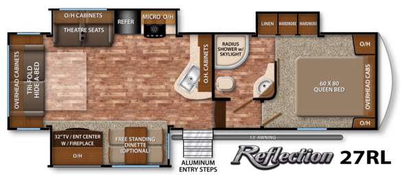 As you enter notice the spaciousness inside with dual opposing slide outs on either side of the unit. The slide to the left of the entry door features a booth dinette, or optional free standing dinette (pictured) along with an entertainment center and fireplace including overhead cabinets.