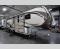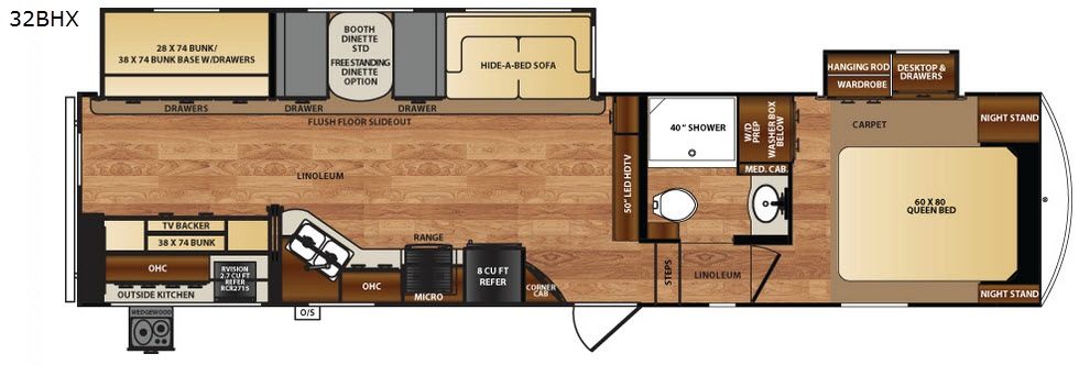 As you enter this model, straight in front of you, along the interior wall there is a 50" LED HDTV for you enjoyment. You can enjoy watch movies or TV in the evening here. To the left of the entry door you will find a corner cabinet, 8 cu. ft. refrigerator, overhead microwave, three burner range, double kitchen sink, and extra counter space. The opposite side of this fifth wheel features a slide out with a hide-a-bed sofa, booth dinette with drawers below, and in the rear bunk house the slide out continues with a set of bunk beds and drawers.