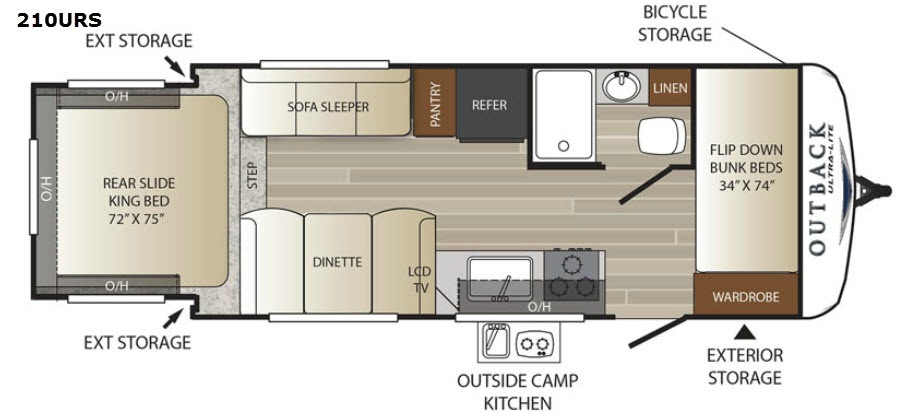 This Outback Ultra Lite 210URS travel trailer by Keystone RV is ideal for a family of four-six. With a rear bed slide and a front set of bunk beds, there is plenty of room to enjoy your time away from home.