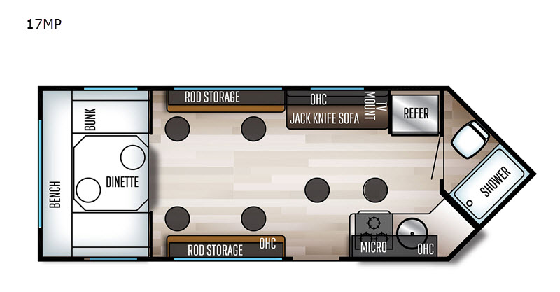 If you are wanting a weekend away from the hustle and bustle of life, then choose this Cherokee Grey Wolf fish house. You will enjoy relaxing indoors while fishing at the same time. There are eight fishing holes throughout this model, and when you are not fishing you can visit with your family and friends at the jackknife sofa or at the booth dinette. Above the dinette there is a flip-up bunk for additional sleeping space. Your fishing rods can easily be stored at the two rod storage compartments along either side of this model, and you will also enjoy the convenience of your own front private bathroom!