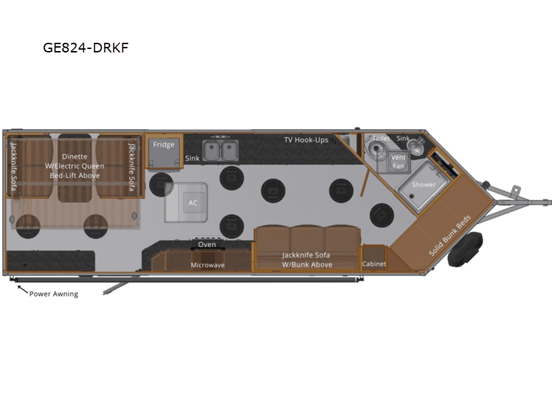 One step inside this fish house and you'll be sold! You and your crew will have eight fishing holes to choose from, a full bath for convenience, plus plenty of storage space for everyone's belongings. This model includes ample counter space the chef of your group is sure to love, plus a three burner range, a microwave oven, and a 110V dorm refrigerator. You'll find sleeping space on the solid bunk beds, the jackknife sofa with a bunk, and the two additional jackknife sofas with a dinette and an electric queen bed-lift above.